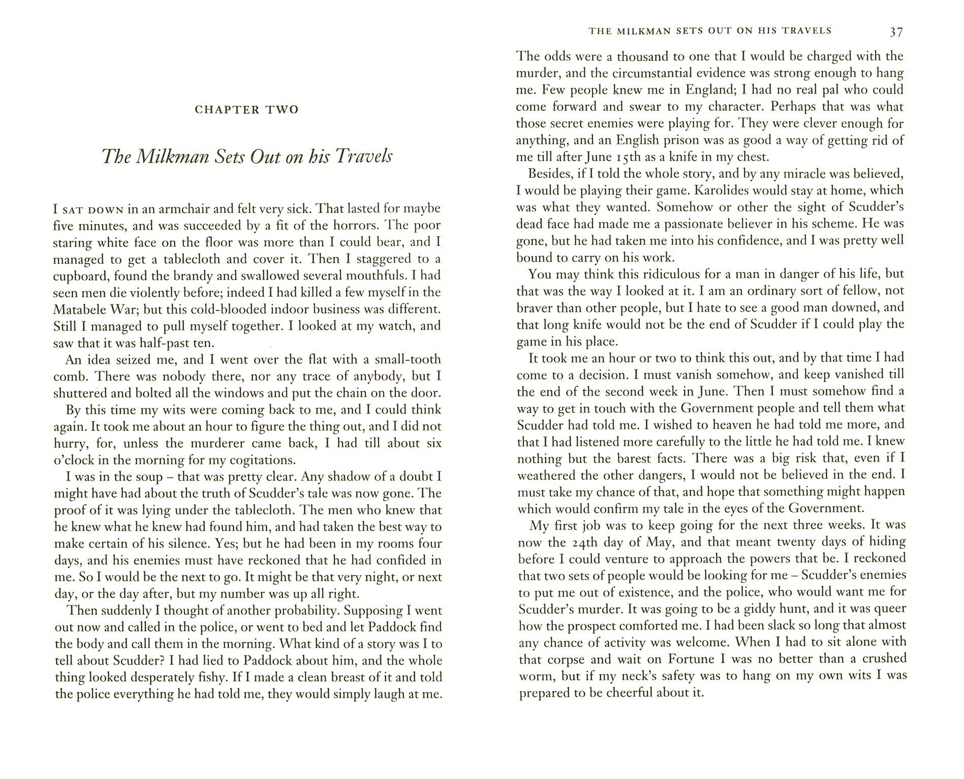 В "Тридцати девяти шагах" рассказывается о Ричарде Ханнее, которому наскучила жизнь, и вскоре он оказывается обвиненным в убийстве и вовлеченным в сложный заговор с целью покушения. Он пускается в бега и, кажется, наслаждается жизнью, несмотря на опасность преследования Скотленд-Ярдом и другими таинственными врагами. Это, несомненно, было по-британски и вызвало у меня немало улыбок.