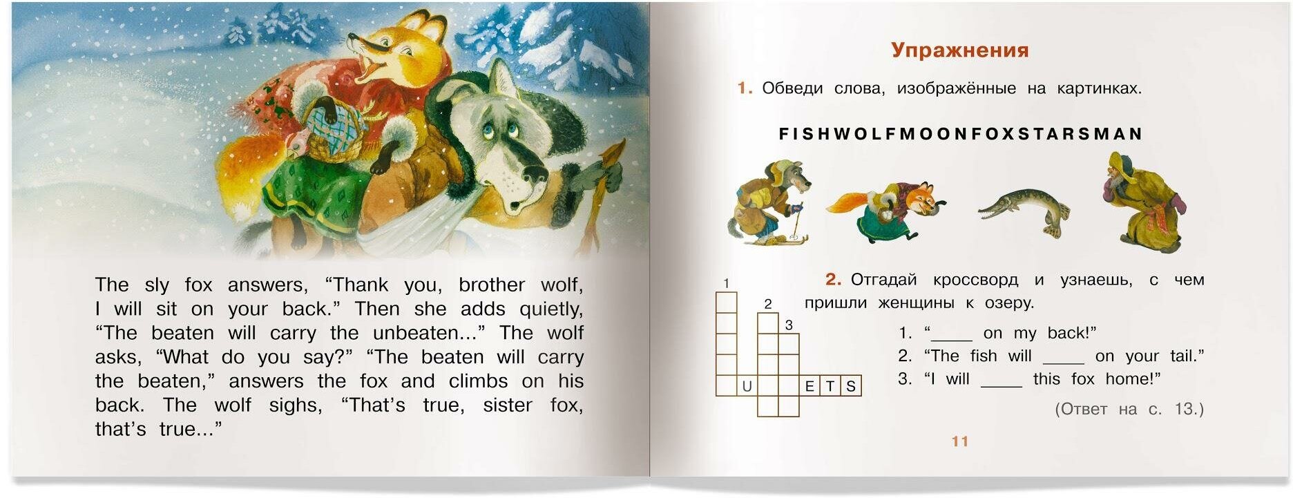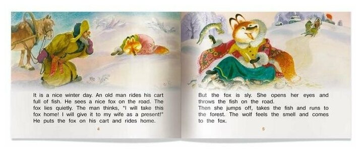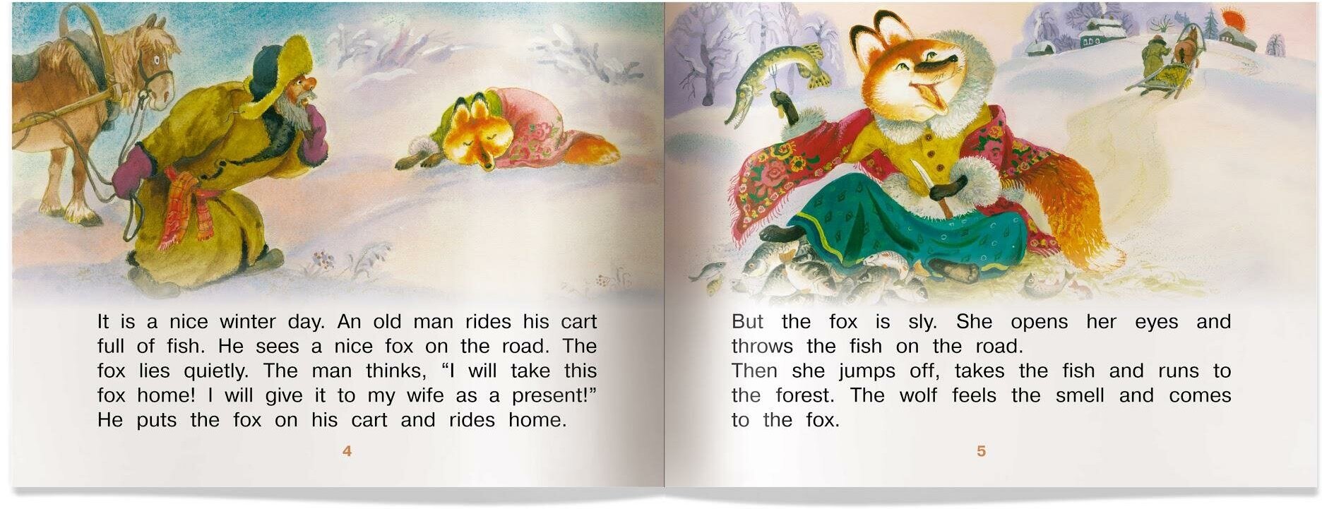 Нам с дочкой очень нравятся все пособия этой серии. Соотношение цена-качество на высоте, что в наше время бывает крайне редко! Данная книжечка - сказка о лисе и волке, которая известна всем, пересказывать её не буду. Язык повествования простой, доступный. Читаю своей пятилетней дочке, задаю вопросы на английском, она понимает сказку. Задания после текста пока оставляем, так как они рассчитаны на более поздний возраст, как и все задания в этих пособиях. Иллюстрации не раздражают, выполнены вполне качественно.