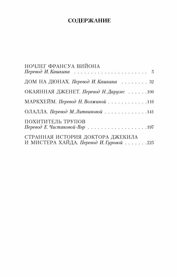 Роберт Льюис Стивенсон - английский писатель, классик неоромантизма и автор приключенческих романов, вошел в историю литературы как тонкий стилист и мастер психологического портрета. "Остров сокровищ", "Черная стрела", "Клуб самоубийц", "Алмаз Раджи" и многие-многие другие произведения, вышедшие из-под пера Стивенсона, занимают прочное место среди шедевров мировой литературы. В настоящем издании вниманию читателей предлагаются широко известные и значимые для творчества самого писателя повести и рассказы: "Странная история доктора Джекила и мистера Хайда", "Дом на дюнах", "Окаянная Дженет", "Маркхейм", "Олалла" и "Похититель трупов".