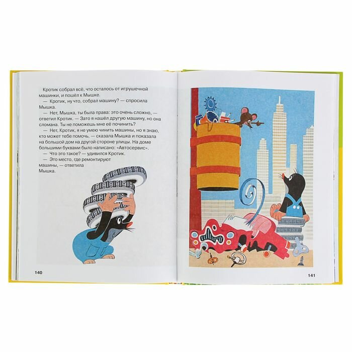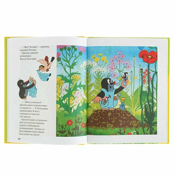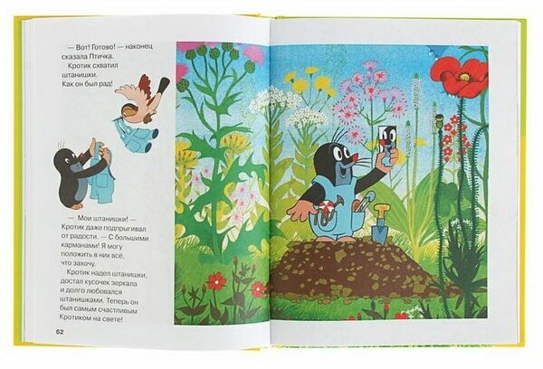 Хорошая, яркая, красочная книга с иллюстрациями, как в мультфильмах! Моя дочь с великим удовольствием смотрела приключения кротика, поэтому, когда увидела книгу, то была очень счастлива! Мы практически сразу прочитали все четыре истории ("Кротик и штанишки", "Кротик и телевизор", Кротик и автомобильчик", "Кротик и ракета"). Большой плюс книги - соответствие иллюстраций и текста, красота иллюстраций; из минусов - неприятный типографский запах, надеюсь, выветрится...