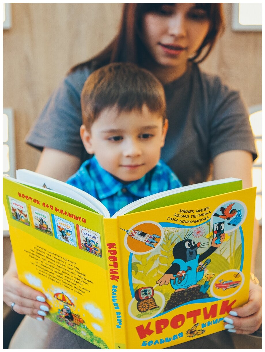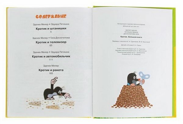 Увидела эту книгу и не устояла от того, чтобы не взать в руки, полистать, посмотреть! А пролистав решила купить, больше для себя и соответственно будем прививать детям то на чем мы сами росли. Всем известная книга, по всем любимому мультсериалу. И сами иллюстрации соответствкют мультипликционным, очень детельные и крупные, ребенок с удовольствием их рассматривает. Хоть рассказы и длинноваты, но на странице текста не много, что очень хорошо для чтения с маленькими детками - не успевают устать слушая и разглядыва. В книге содаржится 4 рассказа про кротика: Кротик и штанишки, кротик и телевизо, кротик и автомобильчик (наш любимый), кротик и ракета. В восторге и я и малыш.