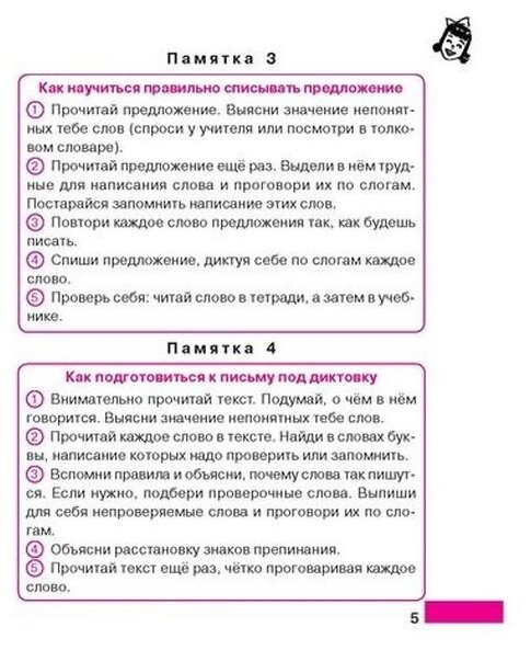 Памятки по русскому языку,чтению и природоведению нареканий не вызывают.Не понравилась математика.Текст воспринимается трудновато.Все идет одним шрифтом ,иногда правила заключено в рамку.Напрмер:Чтобы найти неизвестное уменьшаемое,надо к разности прибавить вычитаемое и даны 2 примера.Понравилась тригонометрия.Немного не так ,как у нас в учебнике даны правила по русскому языку.Например:Имя существительное.В пособии пишут:"... часть речи,обозначающее предмет и отвечающее на вопросы кто?что?У нас в учебнике:"...обозначающее предмет,явления природы,людей и животных..."Не знаю может это мелочи?В целом прекрасное дополнительное пособие в качестве повтора материала.