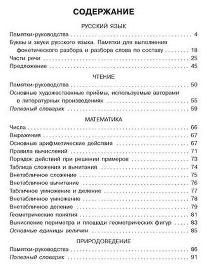 вся книжка, в основном, состоит из таблиц,где всё разложено по полочкам.Как выполнить домашнее задание,вспомнить правила,как правильно выучить стихотворение,есть внетабличное сложение и вычитание, умножение и деление,геометрические понятия....Всегда можно иметь под рукой - учебники большие и их много.Если ребёнок занимается на каникулах - достаточно этой книжки, чтобы вспомнить материал.