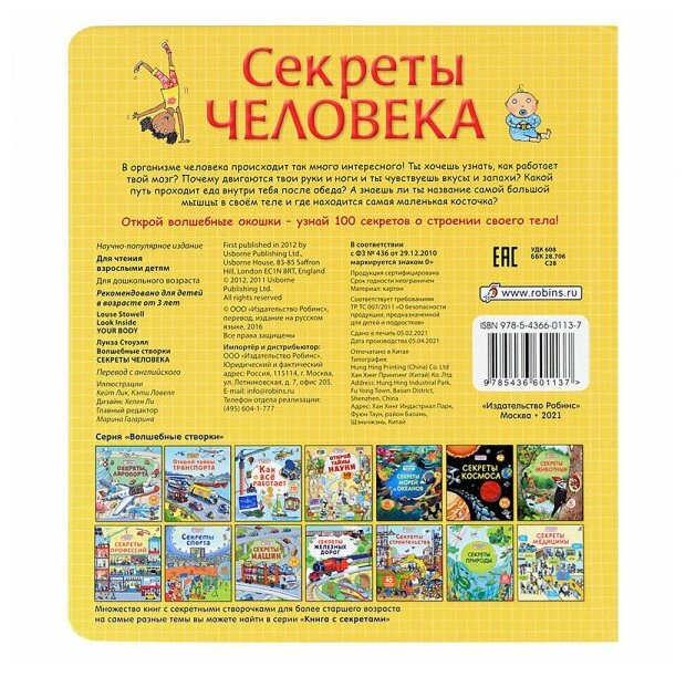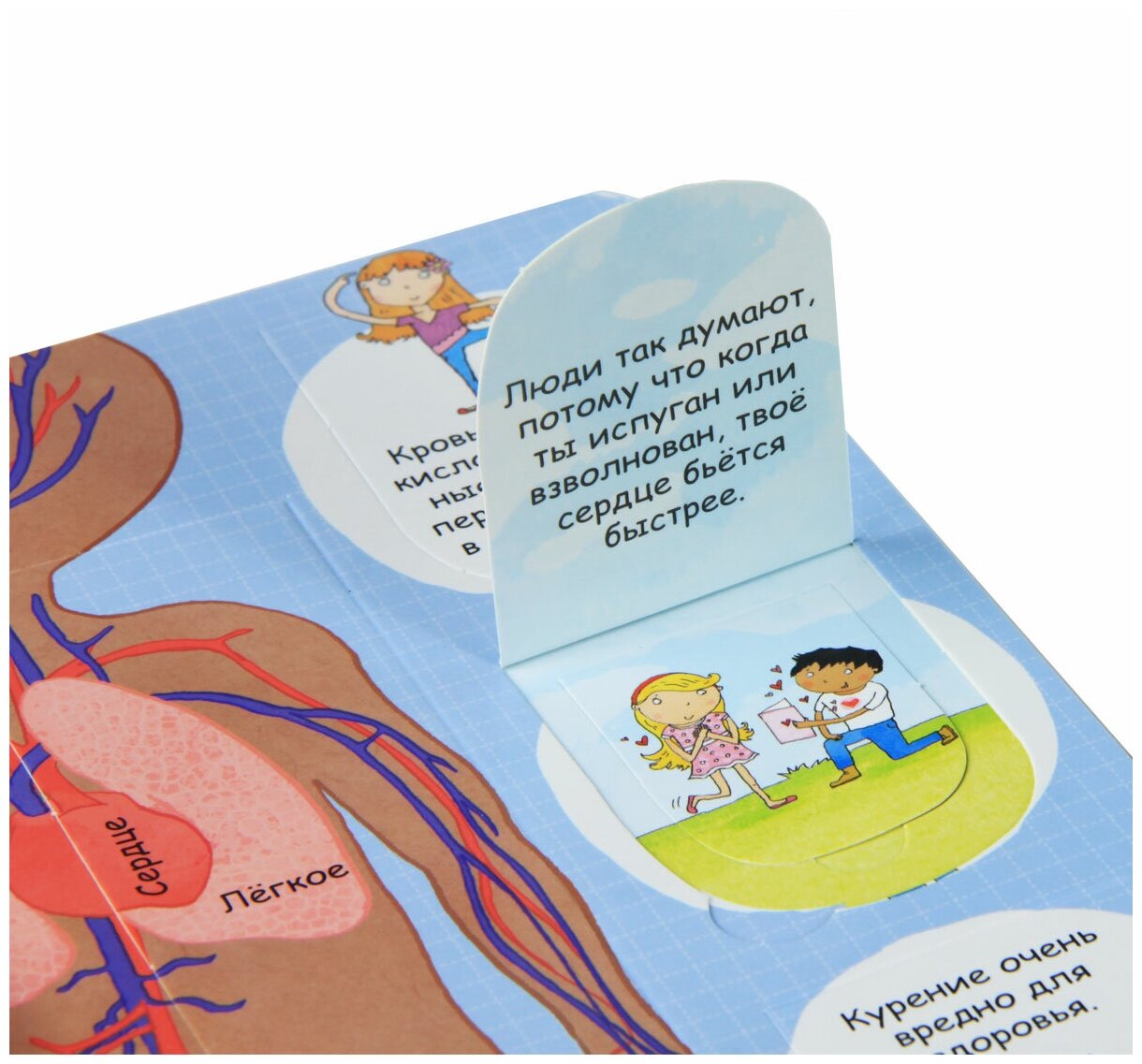 Так много всего происходит в нашем организме! Знаешь ли ты, как работает твой мозг и почему у тебя двигаются руки и ноги? Знаешь ли ты, почему ты чувствуешь вкусы и запахи, и какой длинный путь проходит еда внутри тебя после обеда? А как называется самая большая мышца в теле и где находится самая маленькая косточка? Открой волшебные створки - и тогда ты поймешь, как устроено твое тело и как работают все его части!