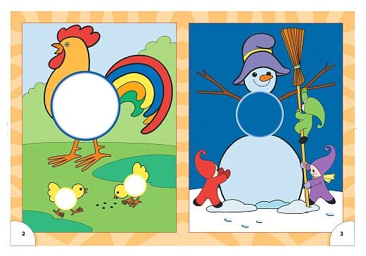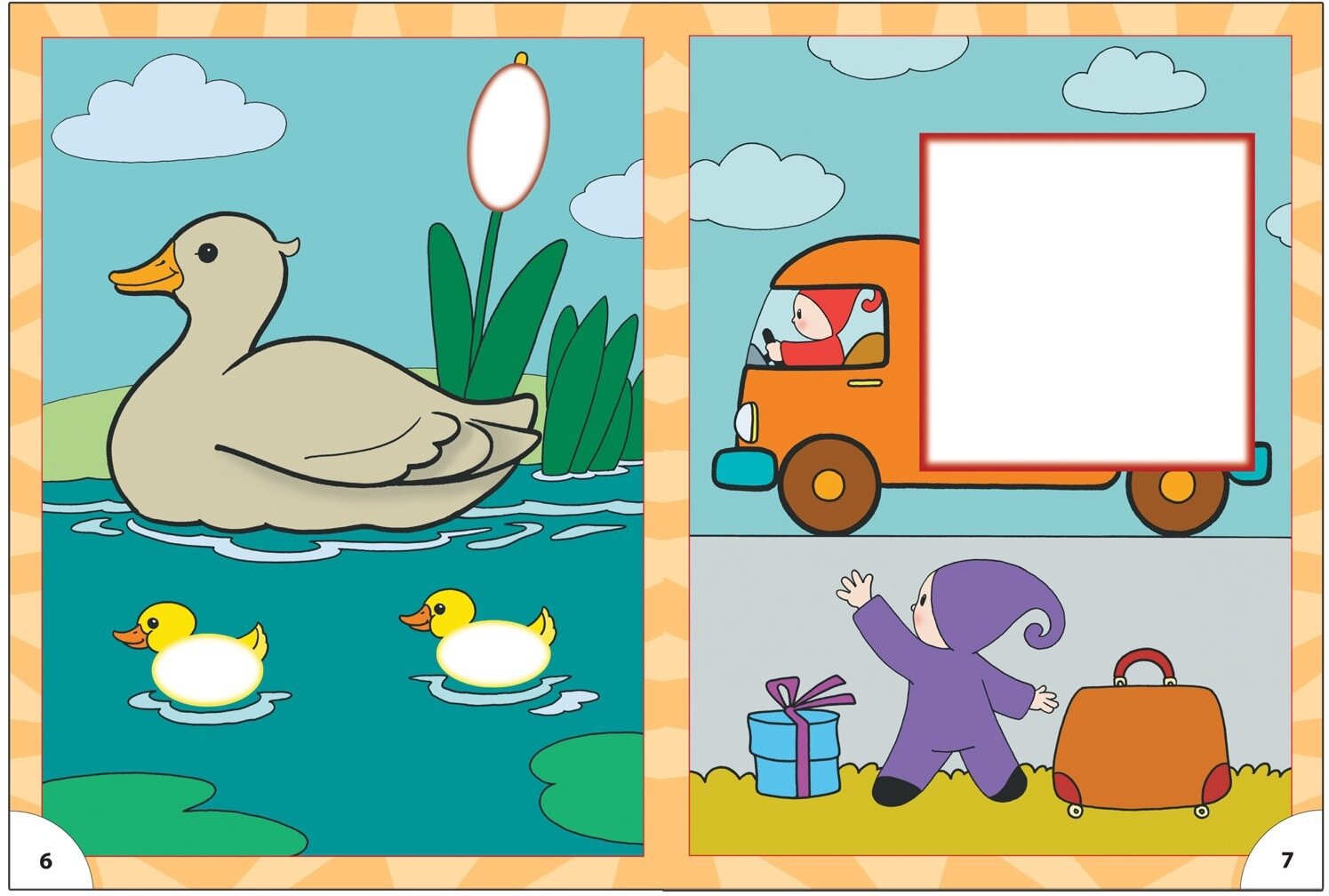 Картинки в книжке следующие: гномики на воздушном шаре, петушок с цыплятами, снеговик, свинка с поросятами, гномик на лошадке, уточка с утятами, грузовик, птичка несет квадратный пакет, гномики строят башню из кубиков, песочница с треугольной крышей, кораблик с треугольным флажком, домик с треугольной крышей.