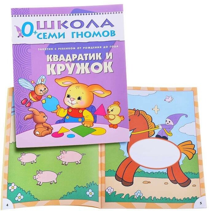 Книжка "Квадратик и кружок" из серии "Школы семи гномов", развивающее пособие, где каждое занятие проводится в игровой форме и учит ребенка понимать картинку, различать предметы по величине, цвету и геометрическим формам.