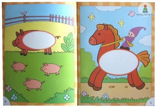 Раскрывая перед малышом очередную картинку, вопросами вовлекайте его в активное рассматривание: Покажи, где гномик? Где красный гномик? Где синий? Где у лошадки хвостик? Как лошадка ржет?