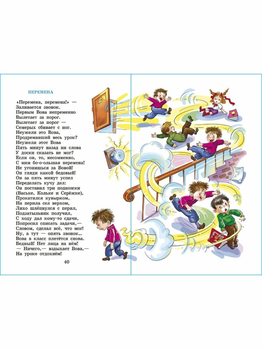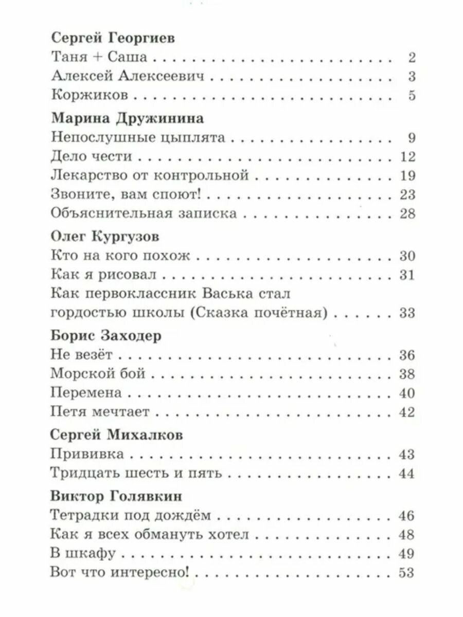 книгу купили случайно, на нее была скидка в магазине. сначала думала что может она нам и не нужна, ребенку всего 4,5 года, но потом решила что за такую цену пусть будет. книга удобного формата, небольшая, можно брать с собой в дорогу, обложка плотная глянцевая, листы немного просвечивают,но не тонкие, шрифт не мелкий - хорошо читать и мне и ребенку потом в будущем. В книгу вошли рассказы С. Георгиева, М. Дружининой, О. Кутузова, В. Голявкина, Л. Каминского, М.Тарловского, О.Тихомирова, стихи Б.Заходера, С.Михалкова, А.Барто, А.Усачева. моему ребенку книга очень понравилась, он хочет в школу))) ему интересно слушать, так же с удовольствием рассматривает забавные картинки.
