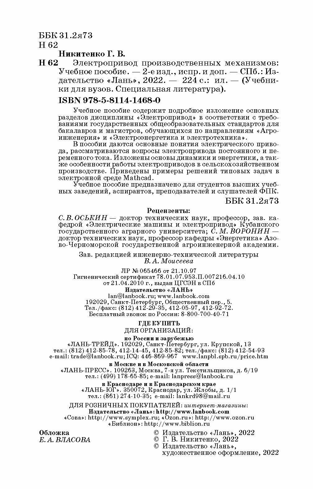 Электропривод производственных механизмов. Учебное пособие. Издание второе исправленное и дополненное (Г. В. Никитенко); Издательство ЛАНЬ, 2021