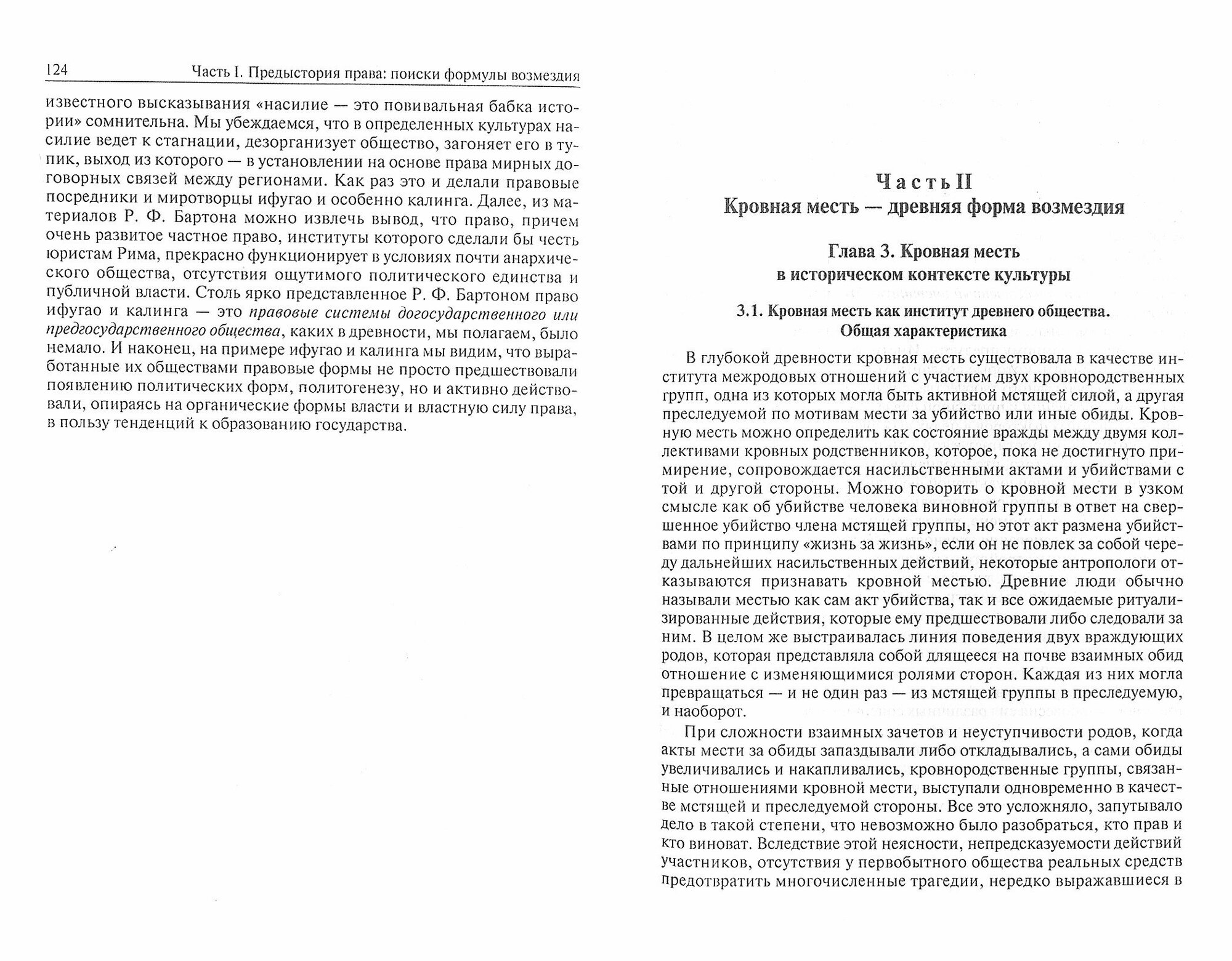 Широкий круг проблем, обсуждаемых в данной книге, характеризует действие принципа возмездия или воздаяния, который начиная с древнейших времен глубоко проникает в общественную жизнь людей, во все ее сферы — от уголовного преследования лиц, совершивших преступления, до международных отношений. В социально-психологическом и историческом плане этот принцип тесно связан с чувством мести, практикой кровной мести, которая рассматривается автором в различных аспектах. Показано, с каким напряжением сил люди искали формулу возмездия, пройдя через горький опыт священных жертвоприношений, особенно человеческих, каннибализма, охоты за головами, межродовых, межплеменных войн. Значительная часть монографии посвящена анализу исторического становления современных форм возмездия (воздаяния), институтов древнего правосудия, разрешения споров и конфликтов в традиционных культурах. Завершают книгу размышления автора о некоторых современных проблемах судебной системы, о способах снижения социазьной конфликтности, а также выводы относительно природы мести и смысле возмездия.