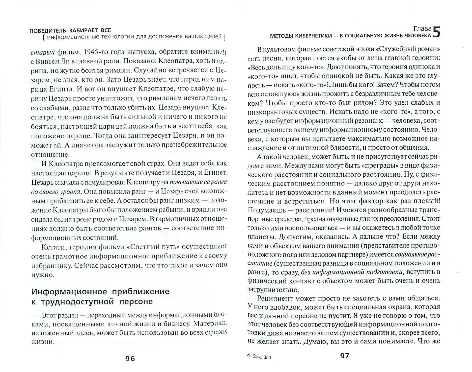 Книга Т. Г Трофименко «Победитель забирает все» является продолжением книг «Твой бой без правил» и «Еда без правил». Она расскажет о свойствах информации, с помощью которых человек может выстроить свою жизнь так, как только он пожелает сам, выйти за рамки своего привычного психологического сценария. Данный подход в психологической практике является новаторским и направлен на успех как самоцель. Книга адресована широкому кругу читателей: всем тем, кто хочет добиться успеха и повысить качество своей жизни.