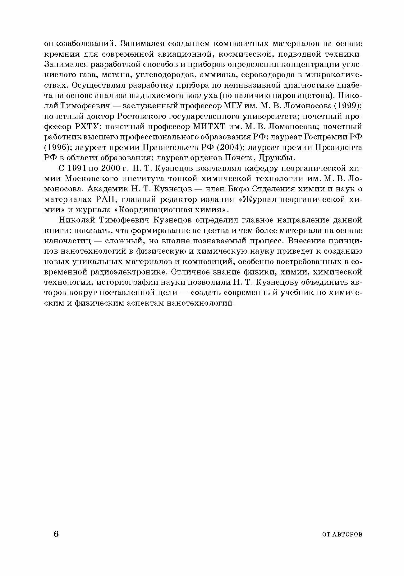 .Проанализированы вопросы самоорганизации наноструктур и некоторые вопросы синергетики, проблемы невоспроизводимости в нанотехнологии и нанодисперсного состояния вещества. Рассмотрены наноструктура объемных и поверхностных областей нанома- териалов, наноразмерные объекты на основе углерода, вопросы нанометрологии. Описаны методы создания упорядоченных нанообъектов, области применения наноразмерных структур и материалов, созданных с их применением, и перспективные направления применения нанотехнологии. Учебник предназначен для студентов, обучающихся по программе бакалавров, студентов старших курсов, обучающихся по программам инженеров, магистров и аспирантов, а также специалистов, работающих в направлении нанотехнологии.