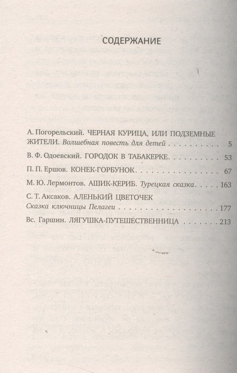 В этой книге собраны самые известные сказки русских писателей XIX века: «Черная курица, или Подземные жители» Антония Погорельского (1787-1836), «Городок в табакерке» Владимира Федоровича Одоевского (1803-1869), «Конек-горбунок» Петра Павловича Ершова (1815-1869), «Ашик-Кериб» Михаила Юрьевича Лермонтова (1814-1841), «Аленький цветочек» Сергея Тимофеевича Аксакова (1791-1859) и «Лягушка-путе-шественница» Всеволода Михайловича Гаршина (1855-1888). Взяв свое начало в фольклорном творчестве, эти истории — в лучших традициях отечественной классики — увлекательно, остроумно и поучительно, зачастую в аллегорической форме, рассказывают детям о самых важных и сложных явлениях окружающей жизни, учат добру и смелости, умению быть честным и держать слово, дружить и удивляться чуду. Каждая из .сказок отличается оригинальным слогом и манерой, атмосферой волшебства и тайны, особенным колоритом — словом, уже не одно десятилетие завораживает и чарует и маленьких читателей, и их родителей.