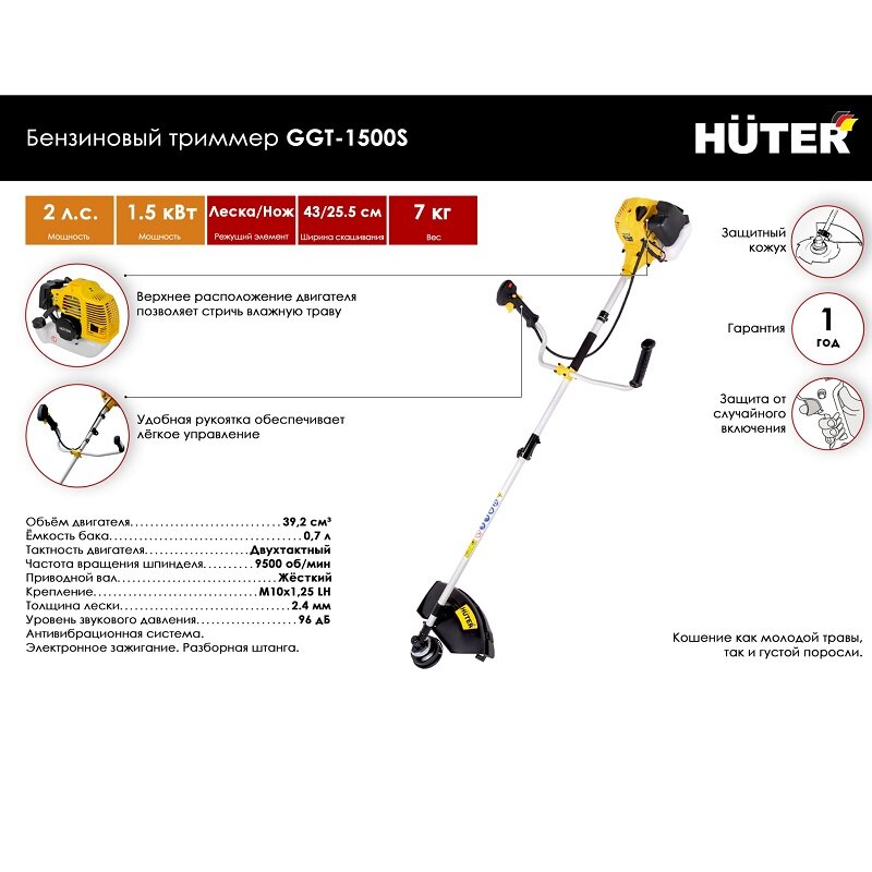 Обладающее великолепной продуктивностью скашивающе-подравнивающее устройство Huter GGT 1500S обеспечивает простую и быструю обработку довольно больших территориальных участков в домашне-бытовых условиях.