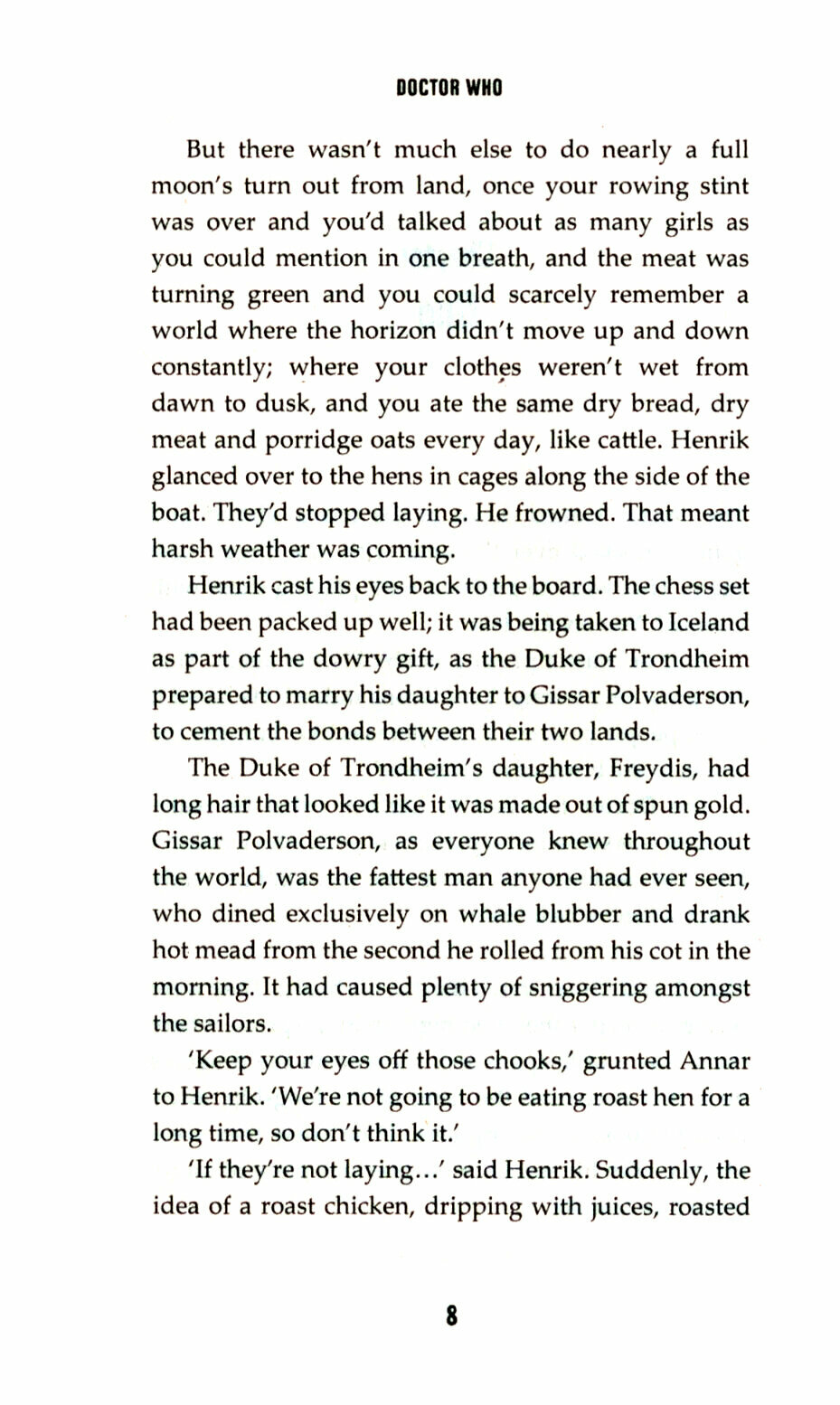 On a windswept northern shore, the islanders believe the worst they have to fear is a Viking attack. Then the burning comes. Water will not stop it. It consumes everything in its path - yet the burned still speak. The Doctor encounters a people under attack from a power they cannot possibly understand. They have no weapons, no strategy and no protection against a fire sent to engulf them all. The islanders must take on a ruthless alien force in a world without technology; but at least they have the Doctor on their side... Don't they?