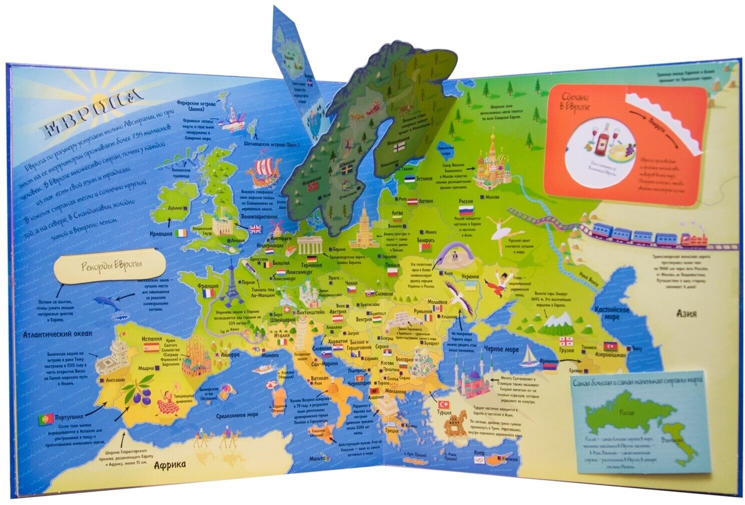 Великолепная книга! Куплена ребенку в подарок, для дошкольников или младшего школьного возраста отличный подарок! Очень яркая, с множеством выдвигающихся и вращающихся элементов, окошечек. Состоит из общей карты мира на первом развороте и отдельных материков на последующих. На карты нанесены названия стран, флаги и крупнейшие города, а также самые яркие достопримечательности, интересные факты и самые яркие представители животного мира обитающие в этих краях. Ничего лишнего, только самое важное и понятным для ребенка языком. Благодаря этой книге мой ребенок познакомился с картой мира самым интересным способом) ребенка не оторвать!