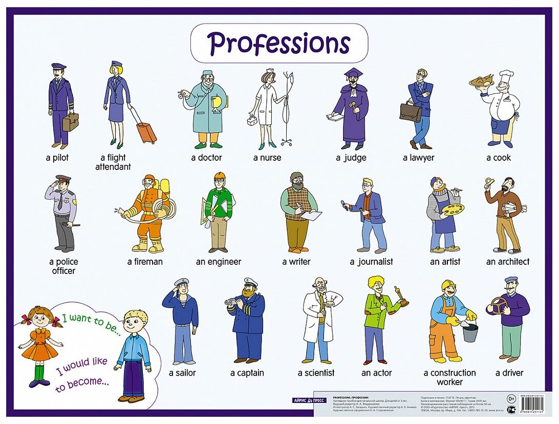 Наглядное пособие "Профессии" посвящено одноименной лексической теме. На плакате изображены представители двадцати профессий с подписями. Плакат позволит учащимся не только освоить названия наиболее распространенных профессий, но также выучить английские конструкции фраз "я хочу быть ", "я хотел бы стать ", которые приведены в левом нижнем углу наглядного пособия.