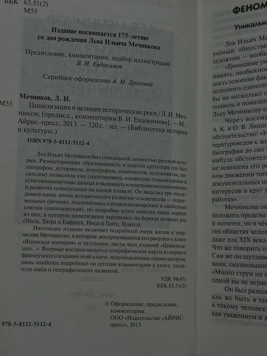 Все четко, по делу и в то же время интересно. Данный научный труд проливает свет на глубинные исторические периоды и процессы, описывает первые шаги человечества на пути становления речных цивилизаций. Автор умело оперирует историческими фактами и работами, развеивает мифы и выдвигает гипотезы. Очевидно, многие памятники истории и археологии утрачены навсегда, однако все же есть надежда раскрыть какие-то загадки. Доверять или подвергать сомнению, решать читателю. Жаль, объем исследования небольшой. Помимо «цивилизации...» подробно описана и биография Льва Мечникова, человека, внесшего огромный вклад в развитие не только истории, но и естественных наук.