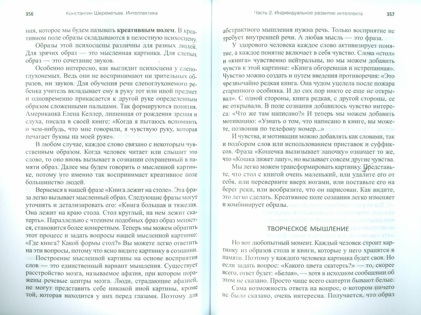 Хорошая книга. Сильная. Умная. Научная. Просто написана. 527 страниц. Рекомендую ее и детям, и взрослым. Очень интересно было читать о том, что такое интеллект, как он работает, истоки его зарождения, зачем он нужен, что в жизни дает и в чем его главные задачи. Например, я не знала, что главная задача интеллекта направлена на достижение целей. Узнала более детально, что такое концептуальное мышление, научилась понимать, что очень многие действия являются стереотипными и потому неосознаваемыми. Поняла, что разрозненные знания обо всем на свете не приносят сами по себе почти никакой пользы и что тест на IQ смысла не имеет. Узнала, что аффирмации действительно работают и мышление на самом деле перепрограммируется. Поняла, что творческие люди хорошо умеют оперировать с жизненными понятиями и достижениями общественного интеллекта, комбинируют их бесконечным образом и поэтому находят успешные пути решения проблем. Выяснила, в чем был гений Сталина, Гитлера и Ленина. И что на самом деле их личные качества почти не имели отношения к их успеху и достижению. Как говорят - уметь держать руку на пульсе. Очень полезная информация для предпринимателей - все об этом говорят, но не так многие умеют применять это. Так что я действительно рекомендую вам эту книгу. Она полезная, нужная и интересная - и взрослым, и детям.