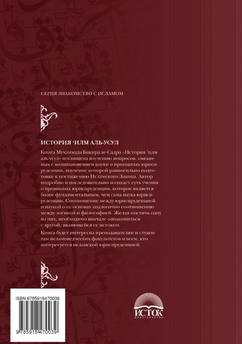 Заглянуть внутрь (несколько страниц в формате PDF) Книга Мухаммада Бакира ас-Садра "История 'илм аль-усул" посвящена изучению вопросов, связанных с возникновением науки о принципах юриспруденции, изучение которой равносильно подготовке к постижению исламского закона. Автор подробно и последовательно излагает суть учения о принципах юриспруденции, которое является более фундаментальным, чем сама наука юриспруденции. Соотношение между юриспруденцией и наукой о ее основах аналогично соотношению между логикой и философией. Желая постичь одну из них, необходимо вначале ознакомиться с другой, являющейся ее истоком. Книга будет интересна преподавателям и студентам исламоведческих факультетов и всем, кто интересуется исламской юриспруденцией. Эта книга будет изготовлена в соответствии с Вашим заказом по технологии Print-on-Demand компанией ООО "Книга по Требованию". Print-on-Demand - это технология печати книг по Вашему заказу на цифровом типографском оборудовании. Книга, напечатанная по технологии Print-on-Demand, представляет собой классический "евро-покет" с соблюдением всех стандартов качества, от офсетной бумаги и плотного картона до качественного клея, используемого при изготовлении. Информация о материалах, используемых при печати: - бумага - офсетная (белая), 80 г/м; - обложка - цветная мягкая (картон 250-300 г/м); - текстовый блок (включая иллюстрации) - черно-белый; - скрепление блока - КБС (по стандарту современных "pocket-books"). Заказ обрабатывается в индивидуальном порядке: каждой книге, напечатанной по технологии Print-on-Demand, присваивается уникальный номер.