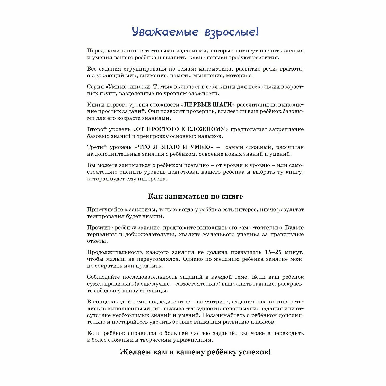 В этой серии вы найдёте книги с тестовыми заданиями трёх уровней сложности для разных возрастных групп. Занимаясь по книгам, вы сможете проверить знания вашего ребёнка и узнаете, какие навыки требуют дополнительного развития.