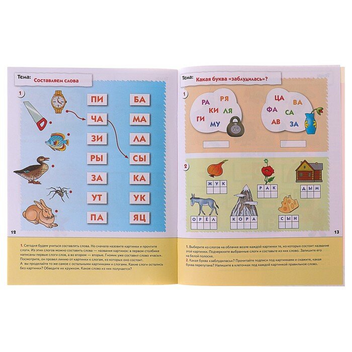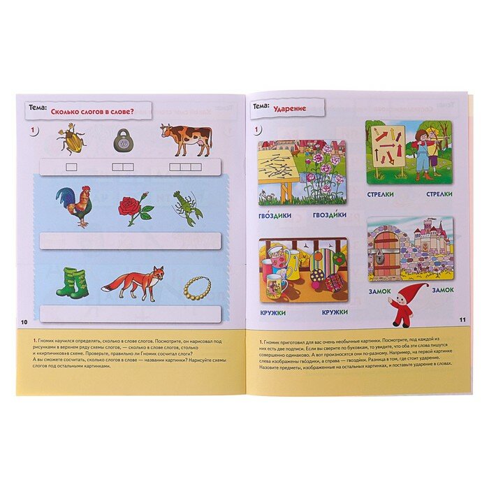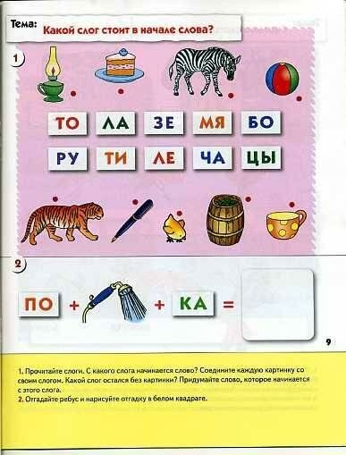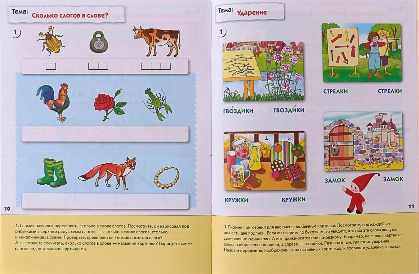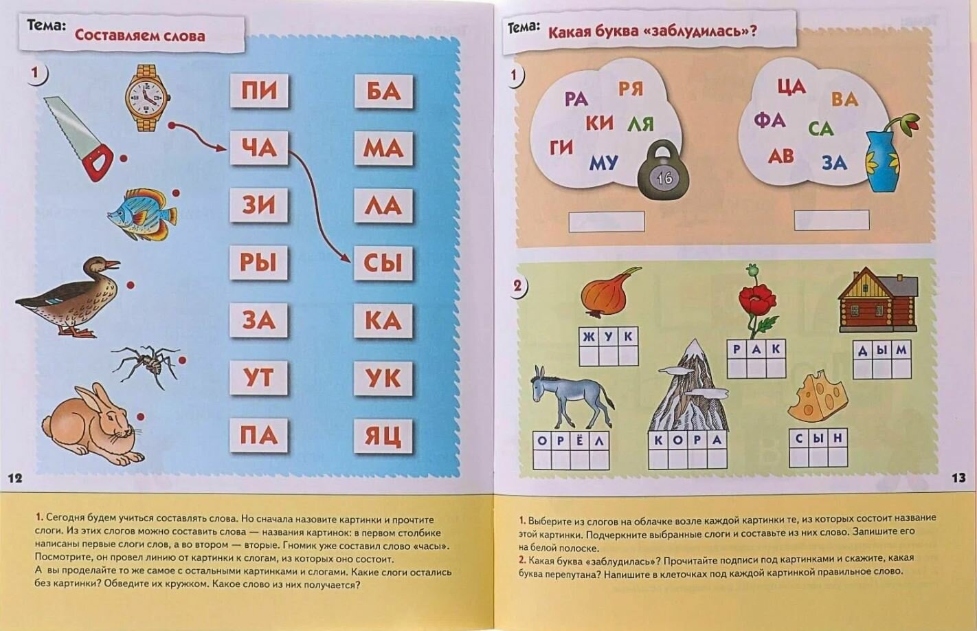 На первых занятиях дети повторяют гласные и согласные звуки, затем переходят к знакомству со слогами, учатся определять, сколько звуков в слове, сколько слогов, на какой падает ударение, пробуют составлять из слогов слова.
