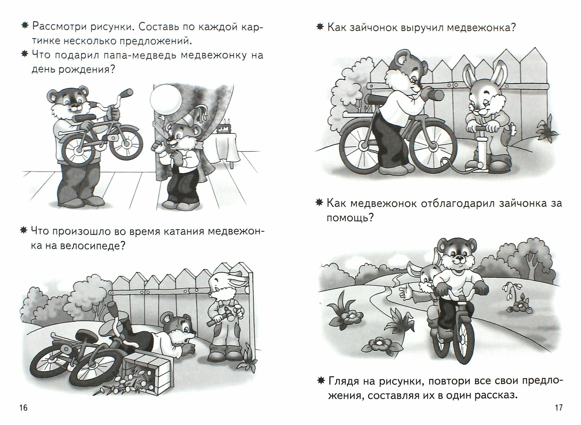 Книга, как обычная тетрадочка с черно-белыми картинками. На первой и последней странице рассказы состоят из 1 картинки. Остальные рассказы состоят из 4-х последовательных картинок. Ребенку предлагается рассмотреть картинки и составить по ним рассказ. Также в книге есть вопросы. Можно проработать каждую картинку, придумав свой рассказ. Можно воспользоваться предложенными вопросами. Когда будет составлен рассказ по всем 4 картинкам, ребенок может сам повторяет свои составленные предложения. Книга мне нравится. Дочка называет кто нарисован на картинке, что делает. Раньше ответ на вопрос - кто нарисован на картинке - звучал: так "это, это, это..". Хорошая подготовка к школе - сочинение по картинке и даже ОГЭ. В 9 классе ребята не могут по черно-белой картинке составить 10-15 предложений.