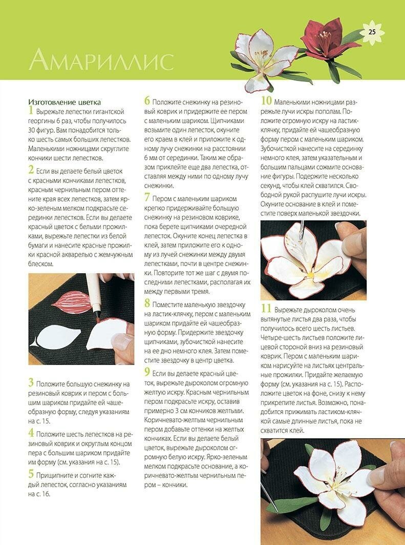 Книгу купила давно, но не пользовалась, т.к. автор советует пользоваться специальными дырокола и для получения цветочных лепестков. Сейчас я начала их вырезать ножницами ( с закругленными кончиками) и все наладилось. В книге подробные мастер-классы, хорошие иллюстрации помогают в работе.