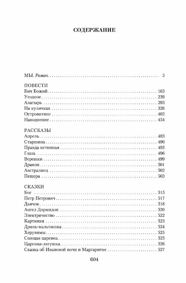 На мой вкус, роман "Мы", эстетические достоинства которого представляются мне сомнительными, заслоняют замечательную малую прозу Замятина. Уж на что хорош, на что ёмок рассказ "Пещера" - в десяток страничек Замятину удаётся описать постреволюционную жизнь и поставить точный диагноз самой революции (при всём том, что написан был, дай бог памяти, в 1918 году, когда не все надежды на революцию ещё угасли). А повесть "Наводнение" показалась мне своеобразной смесью Набокова и Платонова (вот уж где несочетаемое, казалось бы) - хотя Замятин начал писать несколько раньше их. Замятин - это автор, безусловно, талантливый, но к сожалению, ещё не вполне прочитанный.