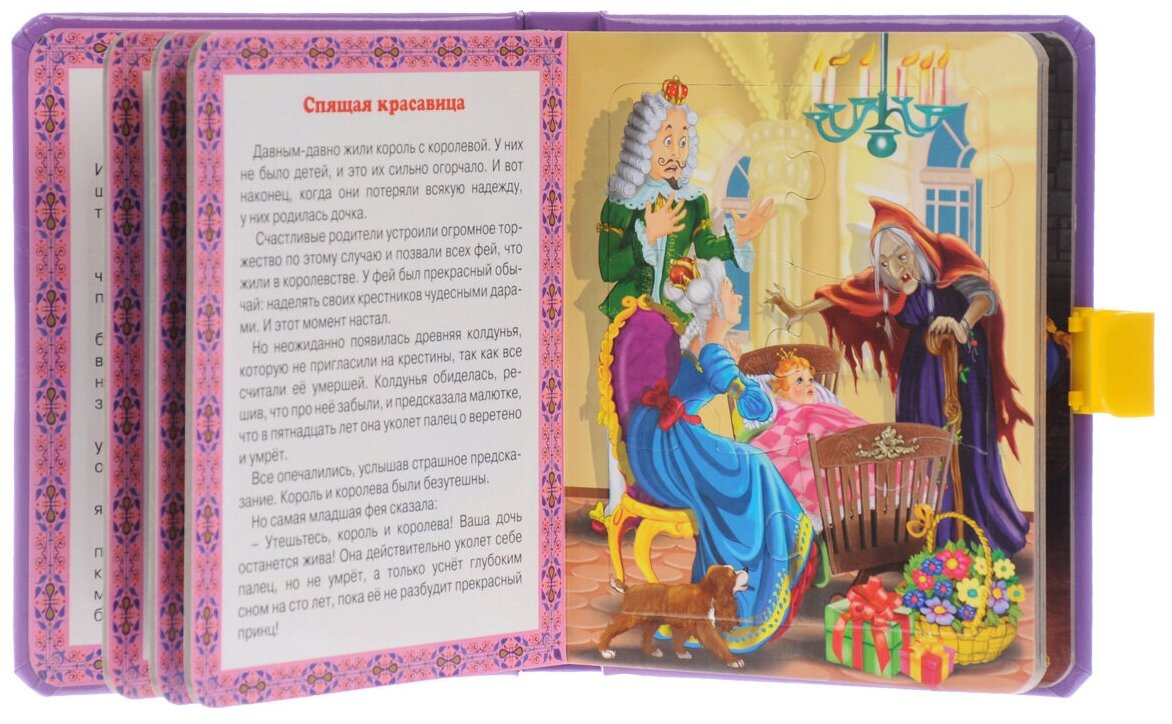 Любимых героев на картинках этих книжек можно не только рассматривать,но и собирать из больших пазлов,встроенных в страницы. Такие элементы, как ручка с одной стороны книжки и замок с другой,обязательно заинтересуют ребёнка. Персонажи сказок на обложке выдавлены конгревным тиснением.