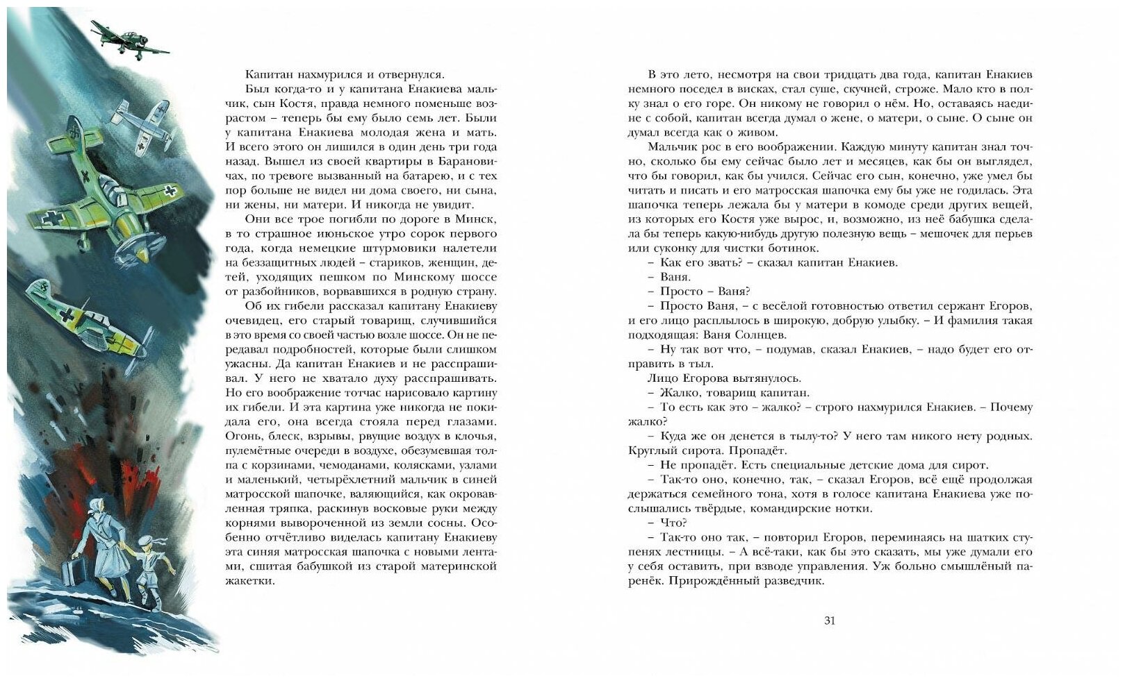 "Ваня ел, облизывал ложку, клал в рот большие куски мягкого солдатского хлеба с кисленькой каштановой корочкой, и ему казалось, что он уже давно живёт в палатке у этих добрых великанов. Даже как-то не верилось, что ещё совсем недавно — вчера — он пробирался по страшному, холодному лесу один во всём мире, ночью, голодный, больной, затравленный, как волчонок, не видя впереди ничего, кроме гибели.