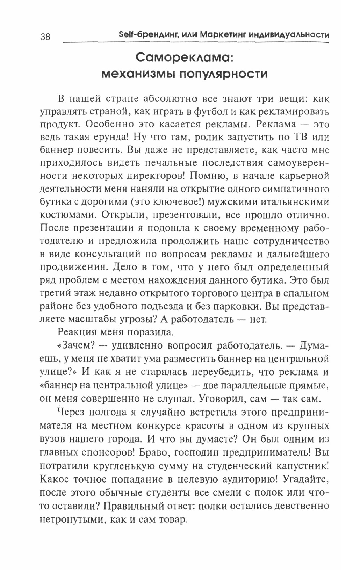 есть много книг о том, как стать успешным, богатым или красивым. есть книги, где рассказывается с какой силой и частотой нужно фантазировать, чтобы наконец обрести желаемое. а есть книги, где после каждой главы, нужно брать ручку, листок и начинать работать. работать над собой, работать с собой, работать вообще. так вот эта книга как раз такая. эта книга о том, как сделать из себя бренд" - человека, который не ищет работу, а которого работодатели ищут сами. о том, как получить работу мечты. о том, как заниматься продвижением свой профессиональной личности. как выделиться среди конкурентов-соискателей. как рекламировать себя и какую цену назначить за свою работу. и, наконец, эта книга о том, как получать удовольствие от своей работы каждый день. книга предназначена всем тем, кто увлечен своей карьерой. тем, кто мечтает добиться больших результатов и получать за это хорошие деньги. эта книга предназначена не только "наемным сотрудникам", но и людям свободным от "офисных оков" - фрилансерам. и те и другие найдут в книге много практических рекомендаций и советов, а благодаря примерам даже самые сложные маркетинговые инструменты станут простыми и понятными. это не просто книжка, это ваш персональный маркетолог, рекламщик, пиарщик и имиджмейкер в одном "флаконе"! с помощью этой книги вы создадите индивидуальный комплекс инструментов для продвижения и развития личной карьеры, определите свои профессиональные сильные и слабые стороны, научитесь понимать своего работодателя и построите карту личностного роста! скрыть"
