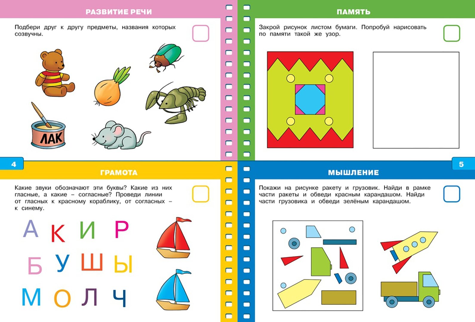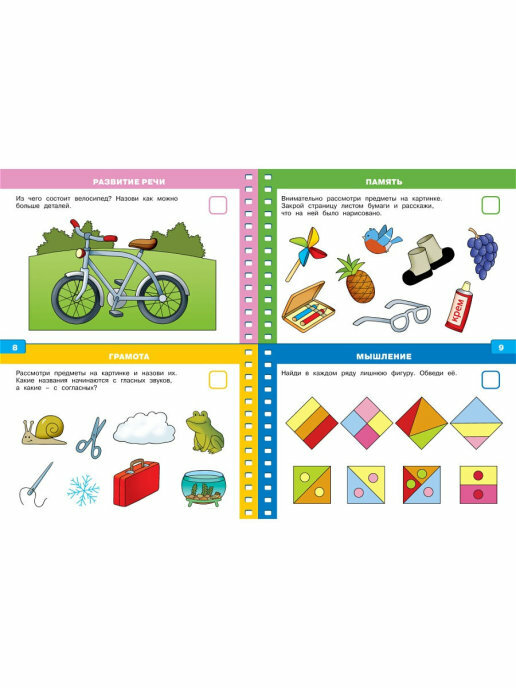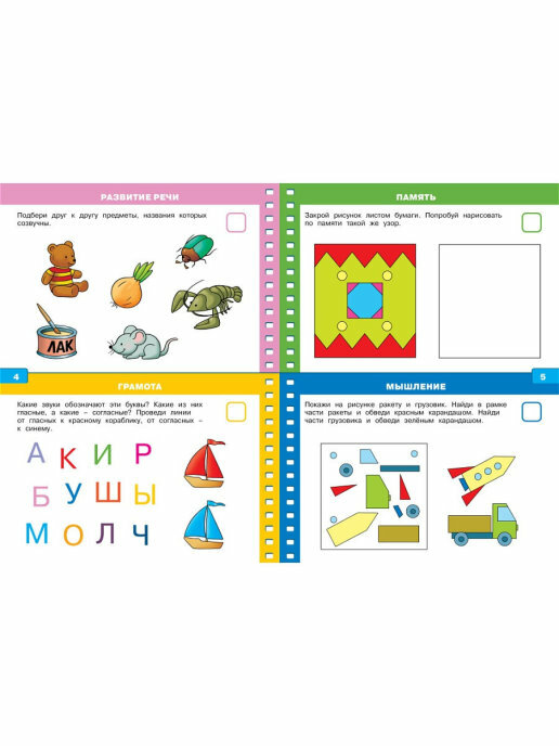 Но опять же дети все разные, ведь есть и такие кто справится со всеми заданиями в 4 года ровно. Ну те, кто еще не умеет читать, им либо пропускать задания, либо открыть книжку чуть позже, когда исполнится 4,5 года.