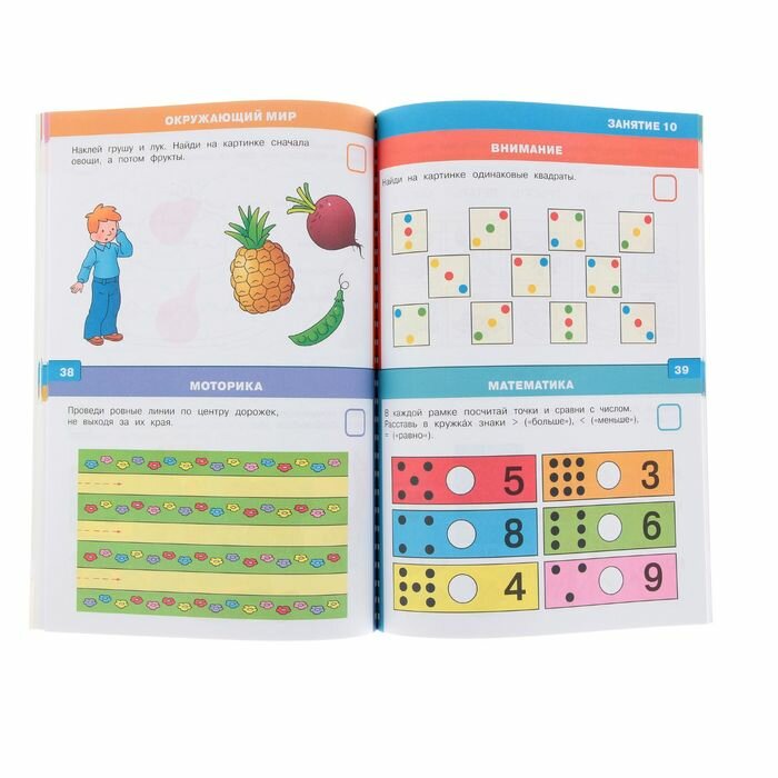Книга из 80 страниц, красивые иллюстрации, 2 листа наклеек. По 2 задания на каждой странице по направлениям: внимание, математика, развитие речи, грамота, память, мышление, окружающий мир, моторика.