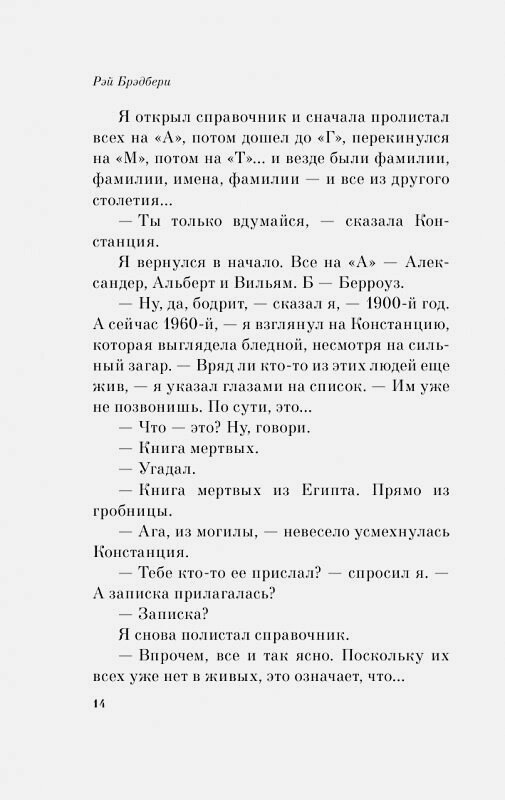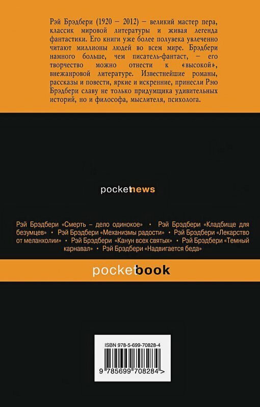 Данная книга Брэдбери очень увлекательная с запутанным сюжетом история. Пусть это произведение не самое лучшее у автора, но определенно оно заслуживает место на книжной полке. Роман захватывает своей быстротечность и постоянно сменяющими друг друга интригующими событиями. Очень понравилась дизайнерская работа обложки, качество выбранной бумаги для печати издания и достоверный перевод не оставляющий вопросов у читателя. Книга в целом хорошая, по всем параметрам оцениваю на отлично!