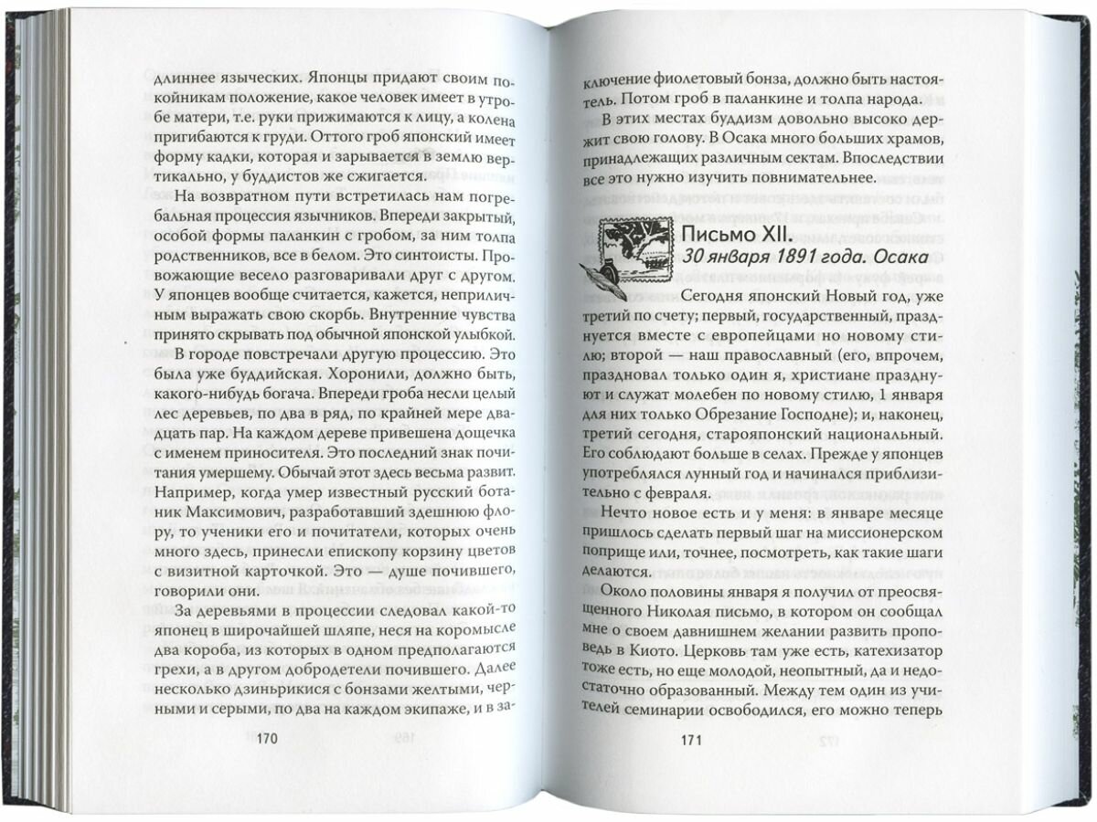 Стильно оформленная книга с гибкой обложкой, фактурно напоминающей дневники, которые можно брать в дорогу. Само содержание чрезвычайно интересно, ведь архимандрит Сергий побывал в Японии почти в одно и тоже время, что и цесаривич (будущий император) Николай. Очень много бесценных для понимания обычной жизни японцев бытовых зарисовок. Благодаря путевым заметкам автора глубже понимаешь историю взаимодействия и его прекрасные примеры России и Японии.