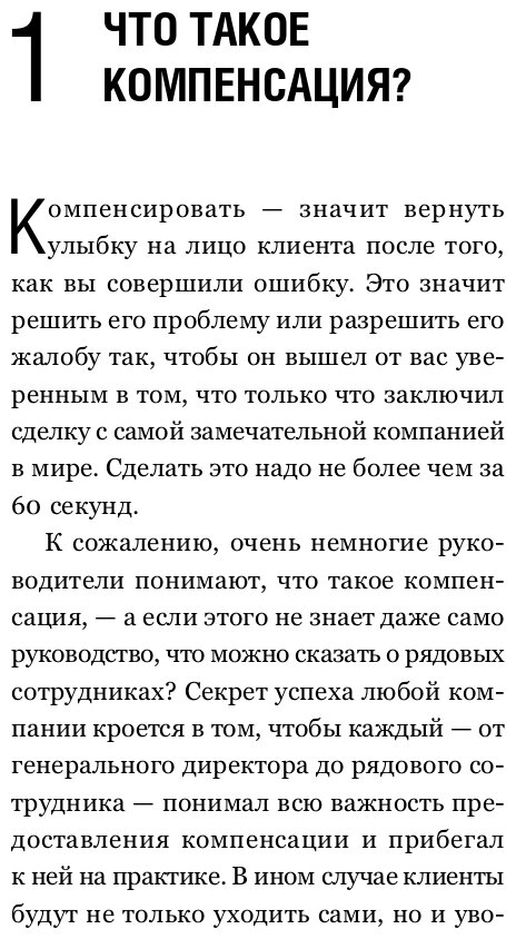 Ошибки совершают все, даже ведущие компании. То, как сотрудники исправляют эти ошибки, — вот что отличает лидеров сервиса от всех остальных. Компенсация — это больше, чем извинения. Компенсировать — значит дать клиенту что-нибудь ценное и тем самым показать, что он для вас действительно важен. Довольные и лояльные клиенты не только останутся с вами, но и будут рекламировать вашу продукцию всем вокруг. В этой книге Джон Шоул — признанный гуру в области сервиса — дает конкретные рекомендации и приводит примеры того, как создать в компании систему компенсации, нацеленную на формирование лояльности клиентов.