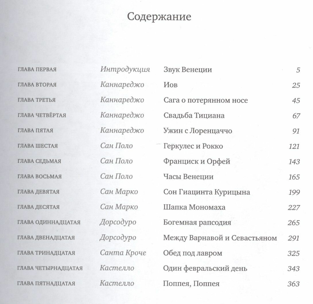 С творчеством автора до этой книги я знакома не была- купила потому, что влюблена в Италию. Это книга для тех, кто хочет знать историю города, посмотреть на него вдумчиво, до самых скелетов в шкафу. Структура книги- город разделен на районы - книга тоже. Автор ведет от объекта к объекту, уходя в историю, связанную со зданиями, каналами и мостами, подбирает литературные образы, музыкальные произведения, отражающие образы Венеции.