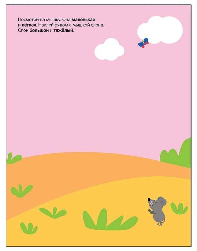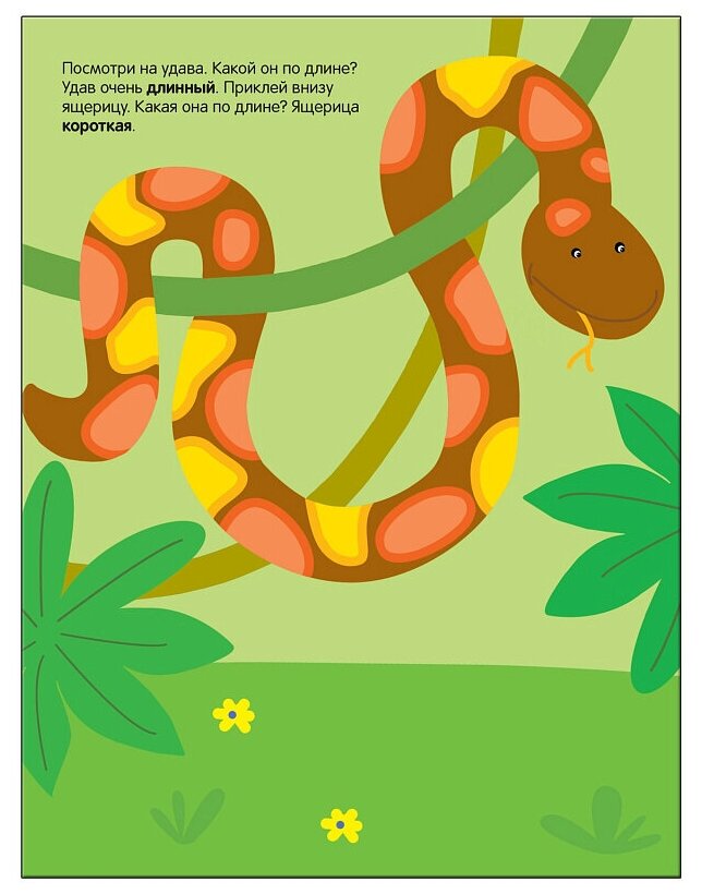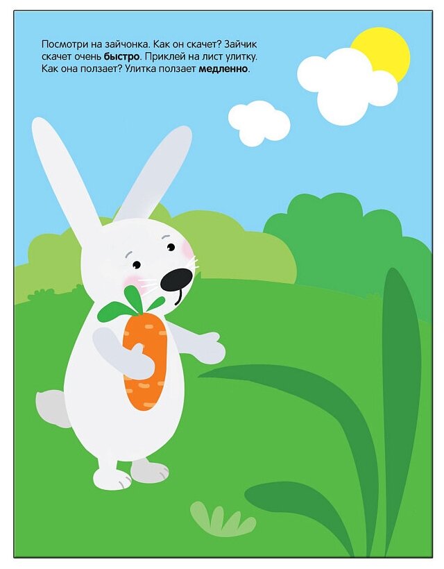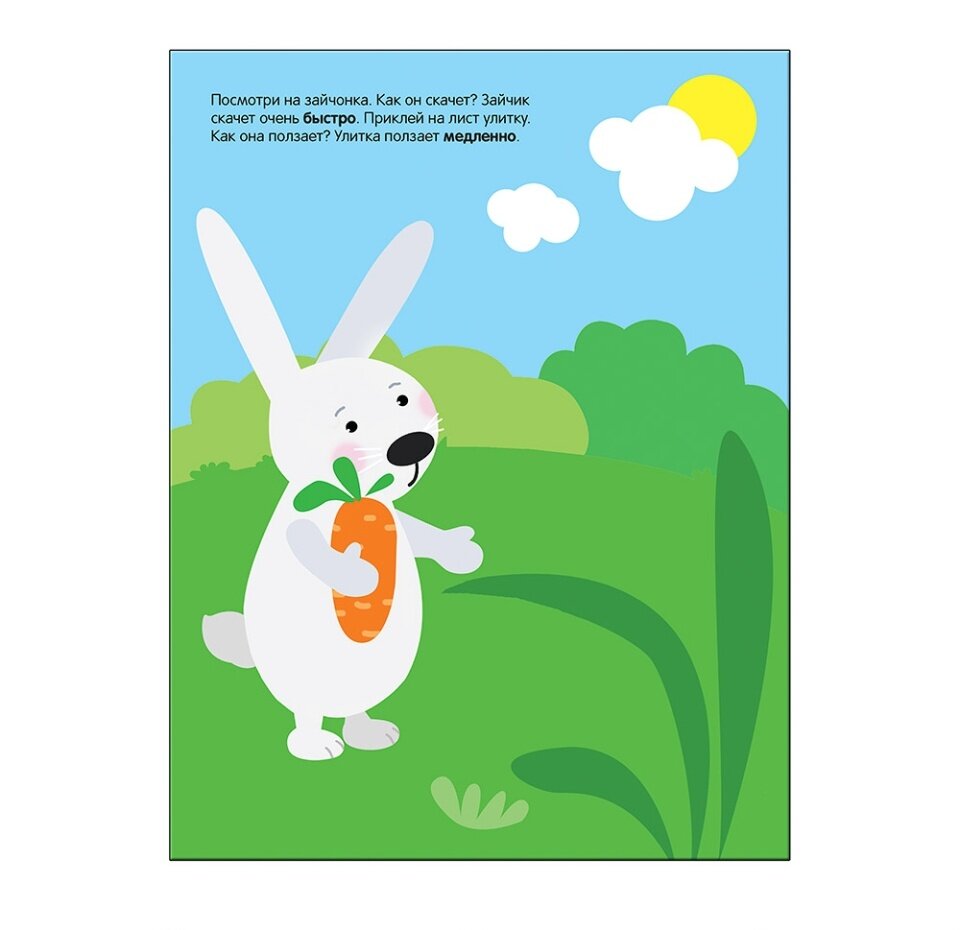 Эта книжка с наклейками предназначена для самых маленьких читателей. Уже в 1 год ребенок способен выполнять задания, приклеивая наклейки в нужное место. Это занятие не только приносит малышу удовольствие и радость, но и способствует развитию речи, интеллекта, мелкой моторики, координации движений, умения находить и принимать решения... Книга познакомит малыша с понятиями высокий — низкий, веселый — грустный, широкий — узкий, твердый — мягкий, быстрый — медленный, короткий — длинный, гладкий — пушистый, большой — маленький. Наклейки в книге многоразовые, так что ребенок может смело экспериментировать, не боясь ошибиться.