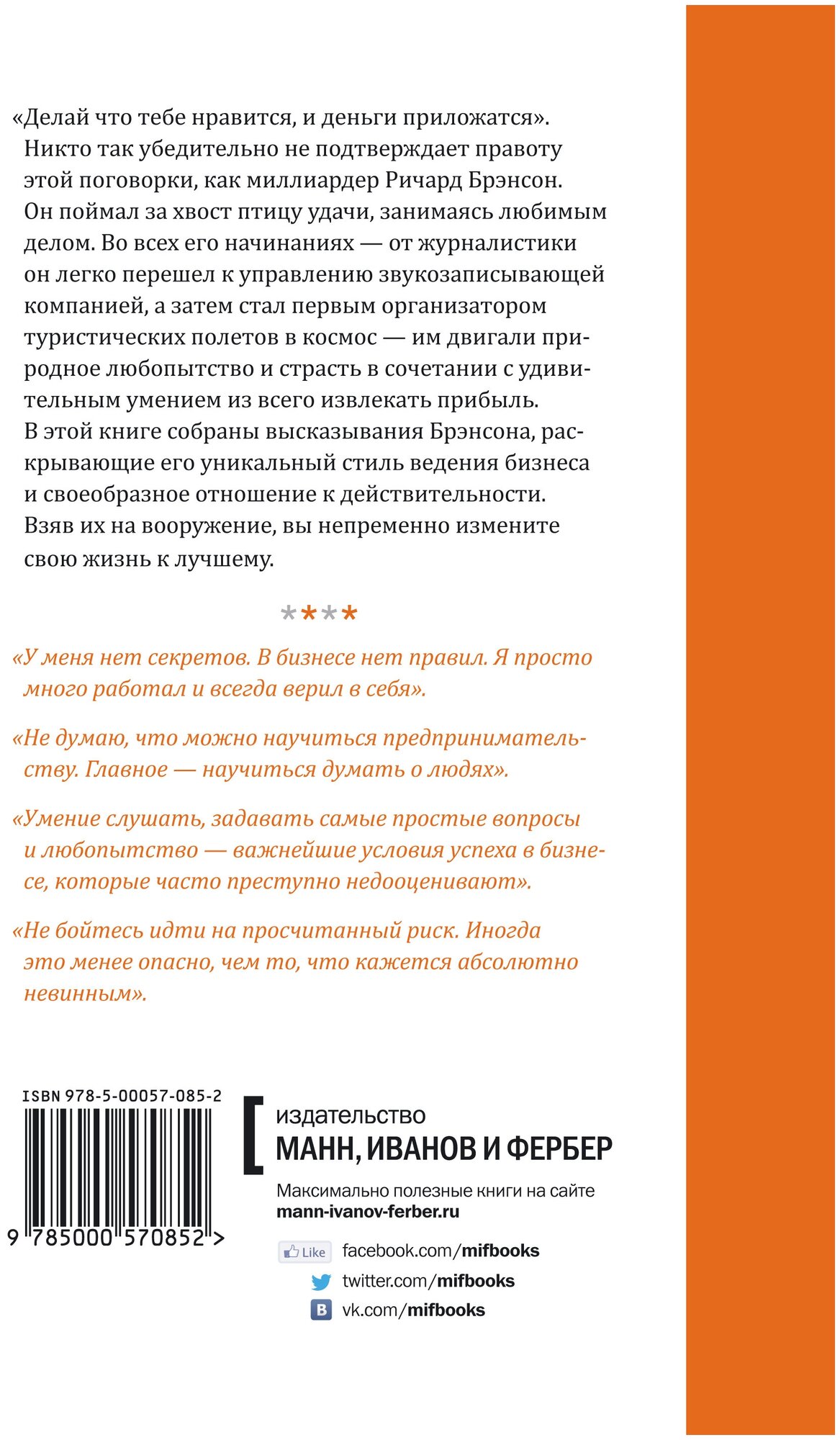 Цитаты сгруппированы по темам: предпринимательство, бизнес и инвестиции, брендинг и маркетинг, лидерство и менеджмент, инновации, авиация и космический туризм, личное, социальная ответственность. В дополнение приводятся краткая хроника жизни Брэнсона по годам и списки действующих и ликвидированных компаний Virgin.