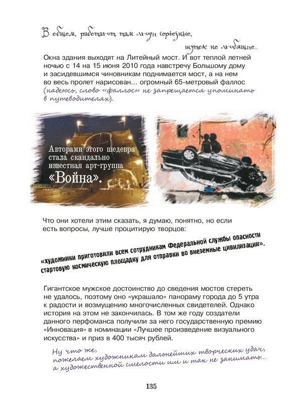 Это книга-находка. Незаменимый путеводитель для всех, кто хочет окунуться в Петербург с головой. Почувствовать его, прожить каждой клеточкой, каждой улицей, каждым мостом, рекой, каналом. Каждым зданием и площадью. Каждой легендой, историй и культовым местом. Рекомендую.