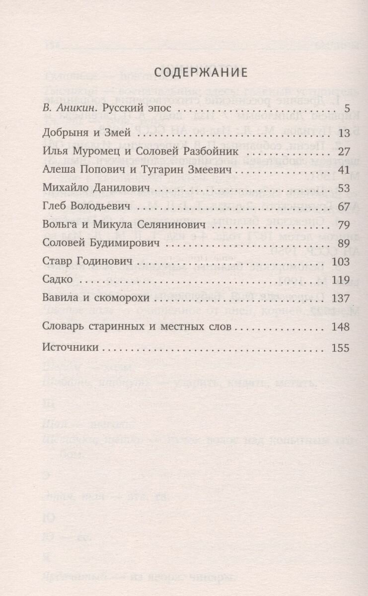 В сборник вошли Признанные образцы песенного эпоса Древней Руси. Это истории о богатырях и героях - Илье Муромце, Алеше Поповиче, Добрыне Никитиче, Садко и многих других. Возникли былины в раннюю эпоху существования древнерусского государства, действие их происходит чаще всего в Киеве и Новгороде, а также в Чернигове, Ростове, Муроме. Из былин можно многое узнать о старинном быте, обычаях, об устройстве древних городов, о воинском оружии, об игре на гуслях, о женской одежде й украшениях, о свадебных обрядах и правилах поведения. Былинный стих отличается ритмическими и стилистическими особенностями и являет собой настоящее языковое богатство. Перед этим искусством благоговели великие русские писатели: А.С.Пушкин, М.Ю.Лермонтов, Н.А.Некрасов, Л.Н.Толстой, а красоту былинных напевов использовали в операх и симфонических произведениях такие композиторы, как М.П.Мусоргский, Н.А.Римский-Корсаков, А.П.Бородин, А.К.Глазунов. Тексты в настоящем издании приводятся по источникам, составленным известными собирателями и этнографами XVTII-XIX веков: Киршею Даниловым, П.В.Киреевским, П.Н.Рыбниковым, А.Ф.Гильфердингом.