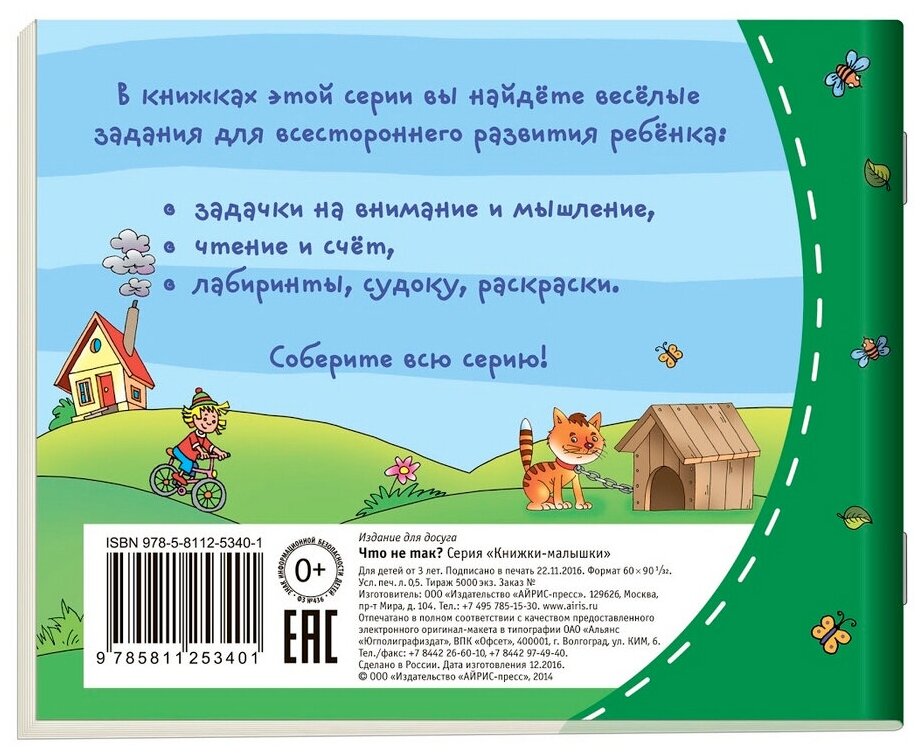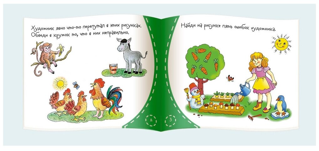 Маленькая книжечка на 16 страниц.бумага плотная рисунки понятные.задания рассчитаны на детей 3-5 лет. покупала сразу 8 таких книжек ,очень удобно с собой брать в дорогу,в поезде есть чем ребенка занять,примеры заданий-найди на рисунке 5 ошибок художника,найди странности в комнате мальчика,животные поменялись хвостами,у кого чей?наверно,самая для ребенка книга из всей серии