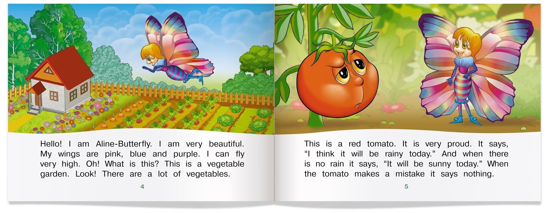 Это вторая книга про бабочку Алину, которую мы приобрели. Как и первая книга, эта также направлена на тех, кто только начал знакомииться с английским языком. Написано, что книга адресована школьникам 1-2 класса, но я читаю дочке 3 года 9 месяцев. Ей нравится. Привыкает к тому, что книжки есть не только на русском языке.. В книге есть счет до десяти. Названия овощей : tomato, cucumber, carrot, white cabbage, potato, onion, corn, sweet peppers. Закрепляются знания цвета, некоторые прилагательные, обозначающие эмоции и характер: proud, happy, sad, friendly, angry, funny. В целом книга понравилась по набору лексики, довольно разнообразна для маленькой книжечки.