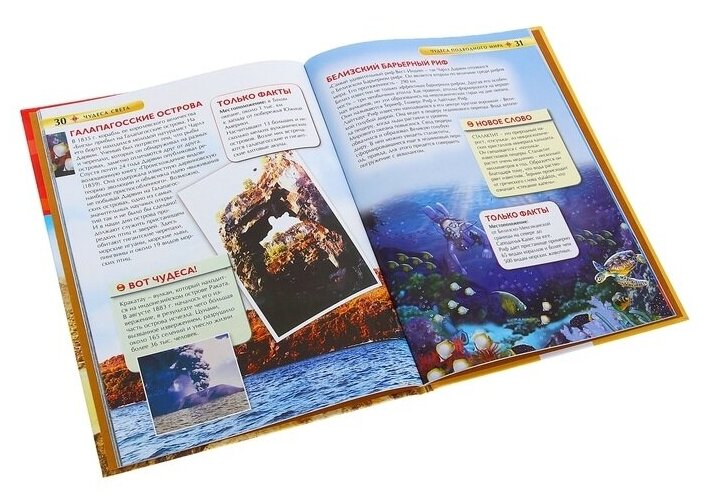 Книга в твердой обложке, небольшая, листы приятные, кратко и понятно всё изложены, есть красивые иллюстрации, которые показывают красоту тех или иных объектов. Но не показаны все чудеса света(самые известные каждому человеку). Но есть и минус: некоторые чудеса света просто нарисованы, и выглядит это не очень-не передает всю красоту того или иного объекта.