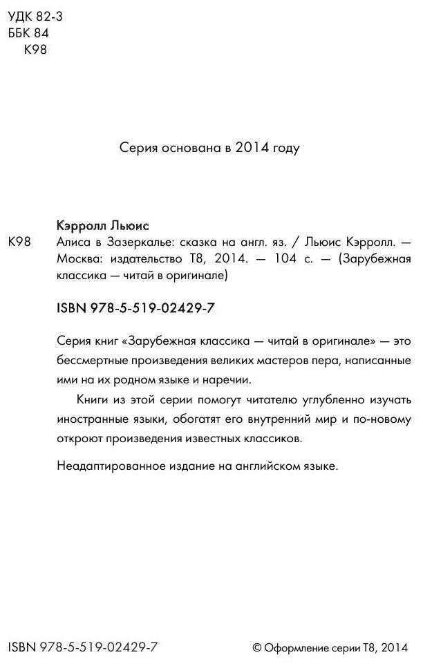На сегодняшний день товар «Книга: Through the Lookind-Glass. Told for Children in English. 1871 = Алиса в Зазеркалье (Lewis Carroll); Книга по Требованию, 2014» можно купить с кешбеком в 1 магазине: book24