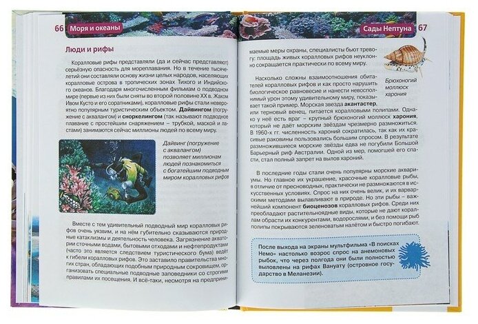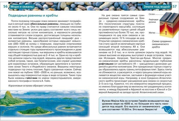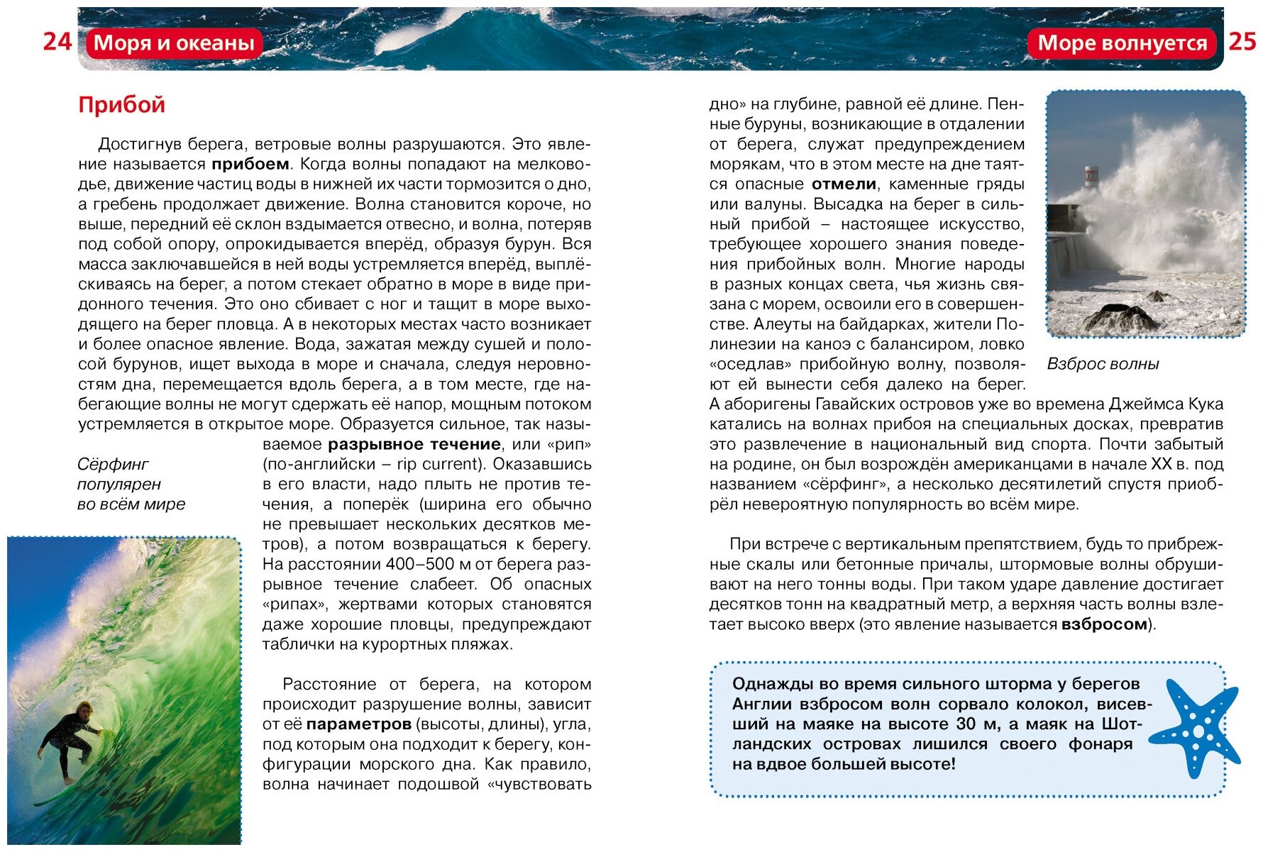 Морей и океанов на поверхности Земли почти вдвое больше, чем суши. Их роль в жизни планеты чрезвычайно велика. Именно в морской воде зародилась жизнь, там началась эволюция живых существ, которые затем вышли на сушу и освоили ее просторы. Человечество с древности прочно связано с океаном: он служит источником пищи, полезных ископаемых, морские пути связывают между собой страны и континенты. Наконец, от океанов и морей напрямую зависит климат Земли. В этой энциклопедии читатель познакомится со всем разнообразием океанов и морей, со свойствами морской воды, ветрами и течениями, строением морского дна и островов, их богатым животным миром и другими интересными фактами.