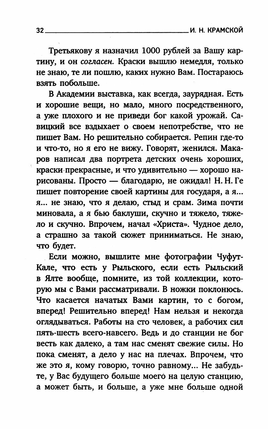 Для меня странная книга. Не понятно для кого издана. Вроде письма художника к художникам, но так мало там про художественные вопросы, что пересчитать легко, особенно в письмах к Васильеву. Много про денежные вопросы, про какие-то бытовые вещи, про то , что случилось и с кем. Половину книги пролистала. Рассуждения про картины и выставки было интересно читать, но уж так мало! Кажется, что книга для историков.