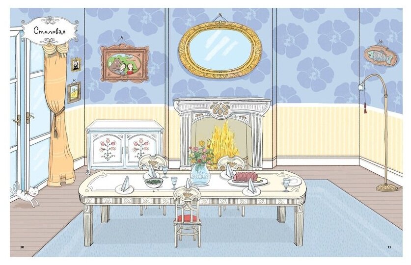 Превосходное издание! Просто восторг. От дизайна до качества полиграфии 10 баллов. Множество деталей, отличная прорисовка. Всё продумано, предусмотрено для жизни большой семьи. Это не кукольный дом, а самый настоящий. В каждой комнате свой облик, обои не повторяются, картины на стенах - отдельная песня. В столовой семейный портрет в объятиях медведей, в спальной лось, воющий на вершине заснеженной горы. На полу раскиданы кубики, книжки, носочки - ощущение жилого помещения. И ты можешь добавить беспорядка, раскидав тапочки и носочки по одному - есть такая возможность. Рядом с наклейками есть указания, которые помогут сообразить где, что лежит.