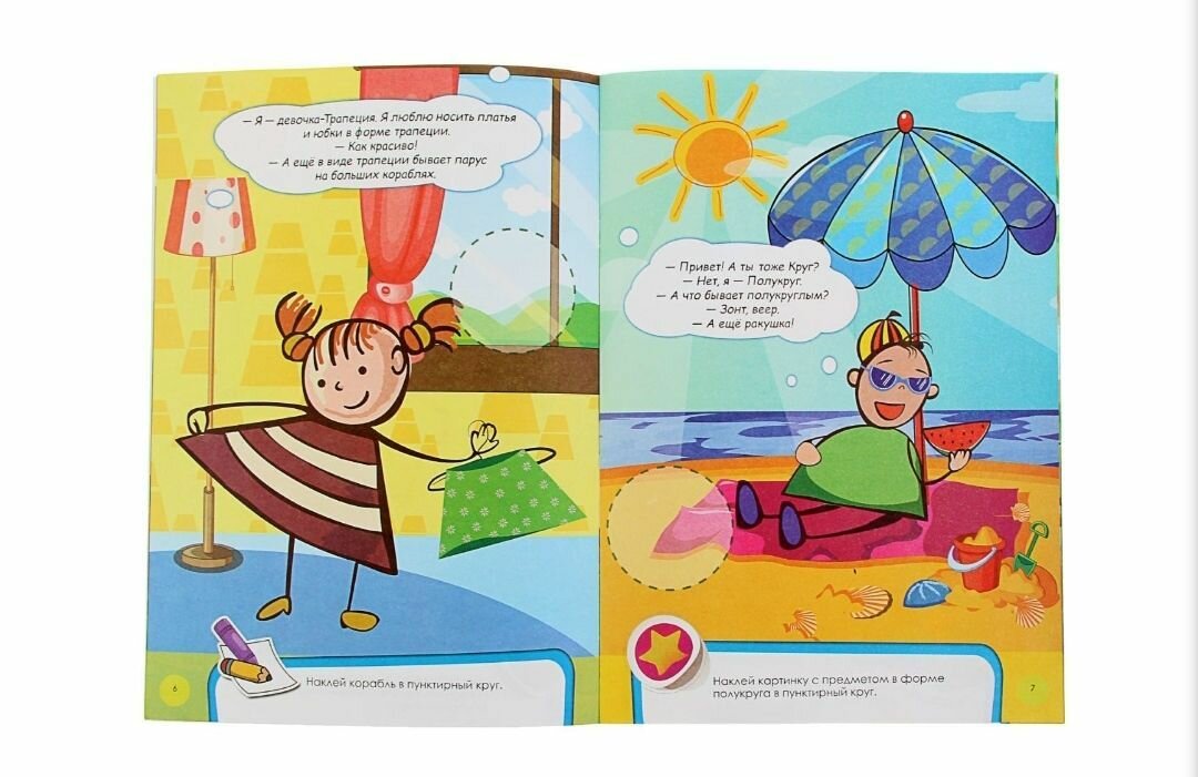 познакомить ребенка с такими понятиями, как форма и цвет, хочется, применяя наклейки. так как именно они больше всего нравятся детям. абсолютно случайно натолкнулась на эту книгу. всегда обращаю внимание на размеры. привлекло то, что книга большая. хоть и тоненькая, но по формату как А4 или даже чуть больше. Обложка у нее прочная. особо не помнешь ее. И не съешь. иллюстрации своеобычные. очень яркие и диковинные. а истории какие! не могу объяснить, в чем причина, но детей от этой книги не оторвать. может, потому что довольно простой текст им понравился. или персонажи. а еще же диплом есть в конце книжки. попросили даже продолжения. пришлось заказывать 2 остальные книги.